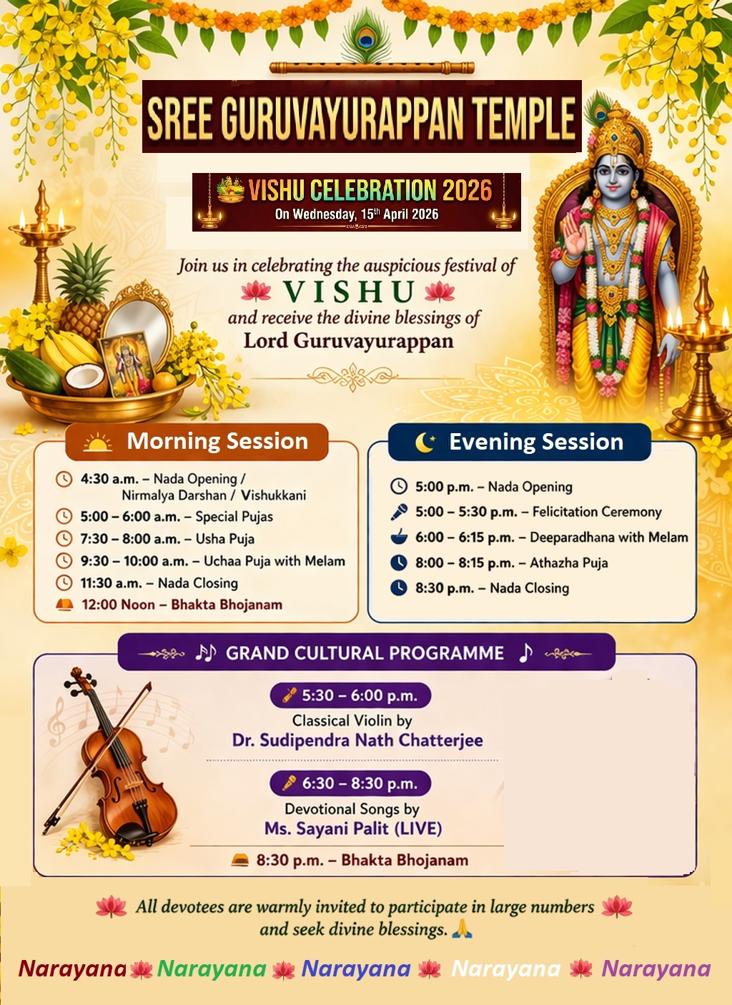 ************************************************************** Next AYILLYA PUJA is on 29-03-2026 (Sunday) at 8am, and this Puja performed on Ayilyam Nakshathram (Star) in every Month, to get rid of Sarpa Dosham. !!!!!!!!!!!!!!!!!!!!!!!!!!!!!!!!!!!!!!!!!!!!!!!!!!!!!!!!!!!!!!!!!!!!!!!!!!!!!!!!!!!!!!!!!!!!!!!!!!!!!!!!!!!!!!!!!!!!!!!!!!!!!!! @@@@@@@@ V I S H U on 15th April 2026 @@@@@@@ !!!!!!!!!!!!!!!!!!!!!!!!!!!!!!!!!!!!!!!!!!!!!!!!!!!!!!!!!!!!!!!!!!!!!!!!!!!!!!!!!!!!!!!!!!!!!!!!!!!!!!!!!!!!!!!!!!!!!!!!!!!!!!! +++++++ IMPORTANT P U J A S IN THIS MONTH +++++++ !!!!!!!!!!!!!!!!!!!!!!!!!!!!!!!!!!!!!!!!!!!!!!!!!!!!!!!!!!!!!!!!!!!!!!!!!!!!!!!!!!!!!!!!!!!!!!!!!!!!!!!!!!!!!!!!!!!!!!!!!!!!!!! ABHISHEKAM & VAKACHARTHU : Every Day Morning *************************************************************** BHAGAWATHY SEVA : 26-03-2026 *************************************************************** CHANDANA CHARTHU FULL : 30-03-2026 *************************************************************** KALABHA CHARTHU : 02-04-2026 **************************************************************** KALABHA ABHISHEKAM : 00-00-2026 **************************************************************** PANCHAGAVYAM & NAVAKAM : 00-00-2026 **************************************************************** SUDHARSHANA HOMAM : Almost every day **************************************************************** UDYASTHMANA PUJA : 00-00-2026 **************************************************************** On Udayasthamana Puja days, Prasadams / offerings will be given to Devotees after UCHA PUJA which is around 10:30am, and the Temple closes at 10:45am **************************************************************** NEW TEMPLE TIMINGS EFFECTIVE FROM 16-03-2026 to 15-09-2026. Everyday Morning 05:00 am to 10:00 am. (On Sundays & Holidays 10:30am) Evening 05:30pm to 08:30pm (Daily Puja Timings at Bottom of this Page) *************************************************************** On Other Important Days & Special Days The Morning Closing Timings will be notified from time to time.