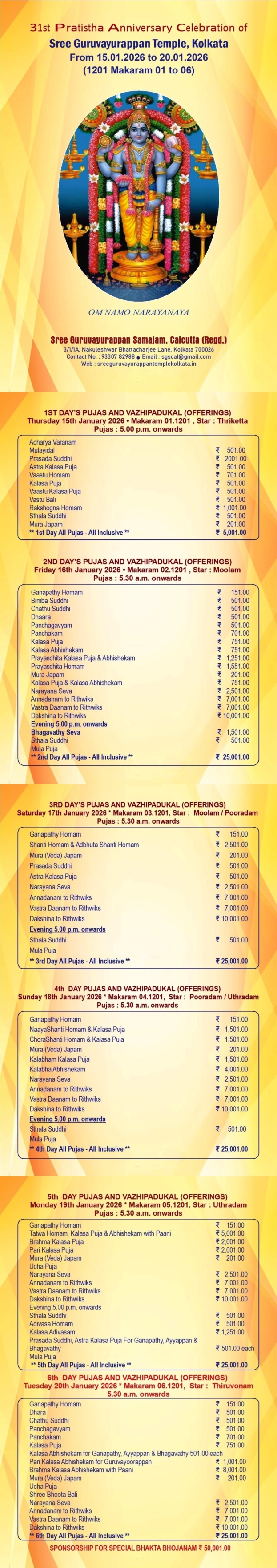 For the benefit of the devotees, every devotee can participate in the daily Special Pujas, Homams, and Abhishekams by offering Special Offerings/Vazhipads and become a part of this great divine event. Details are in the above notice.