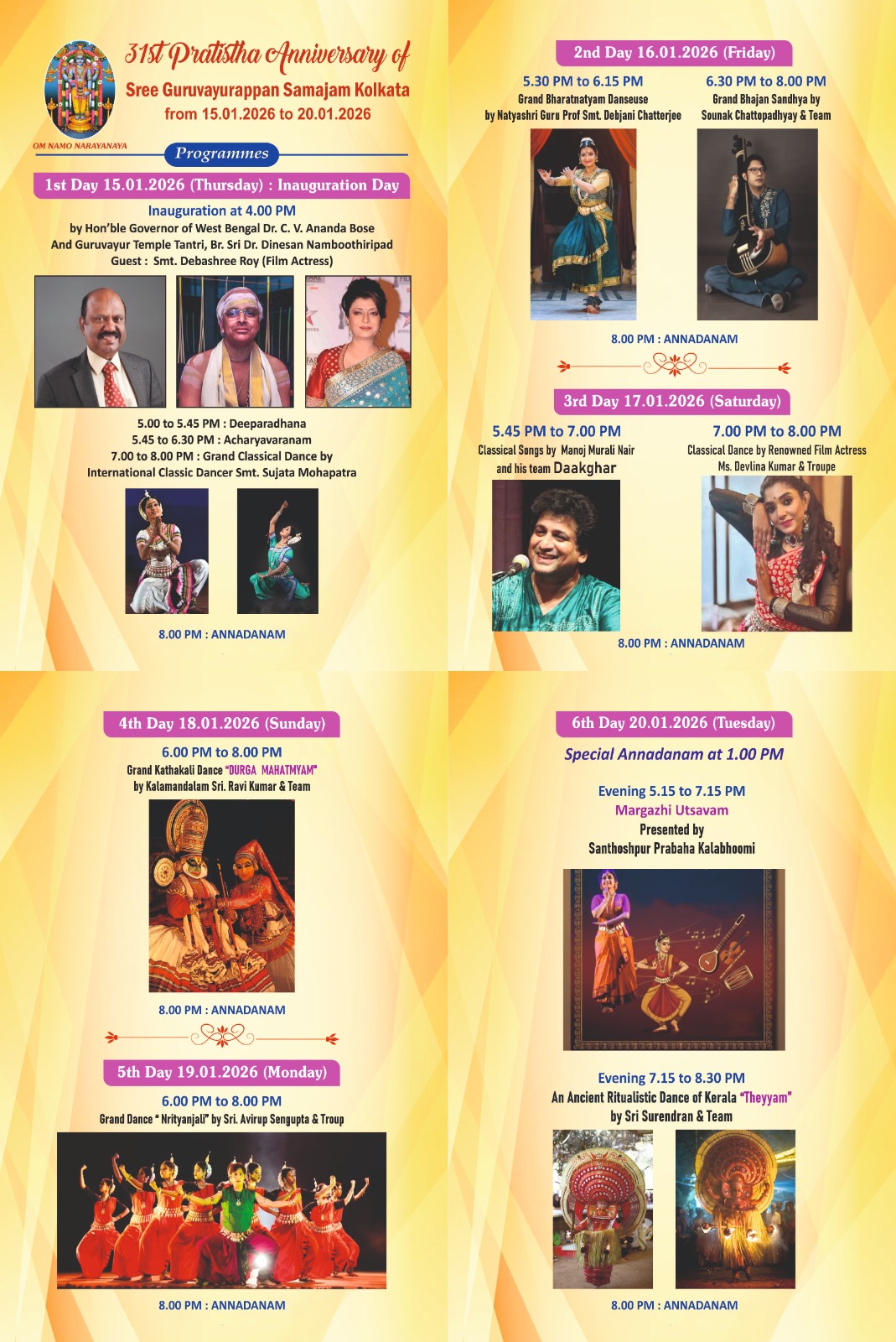 Every Year this Temple celebrates its anniversary during the month of January/February. It is celebrated as the most important event by virtue of the very Sacred Homams, Pujas and Abhishekams performed with utmost Shraddha, to enhance the Chaitanya of the Presiding Deity and the Upadevatas under the supervision of Temple Thantri Acharyya Ratna Brahmasree Puzhakkara Cennas Dinesan Namboodiripad and strictly in consonance with Vedic and Tantric tenets. It is a strong belief, rather experience, of the devotees public that the rare Tantric rites and rituals performed by the Temple Thantri along with a learned and select team of Acharyyas from Kerala. The six-day function concludes on Thiruvonam star, the birthday of the Lord in the month of Makaram of Malayala Masam.